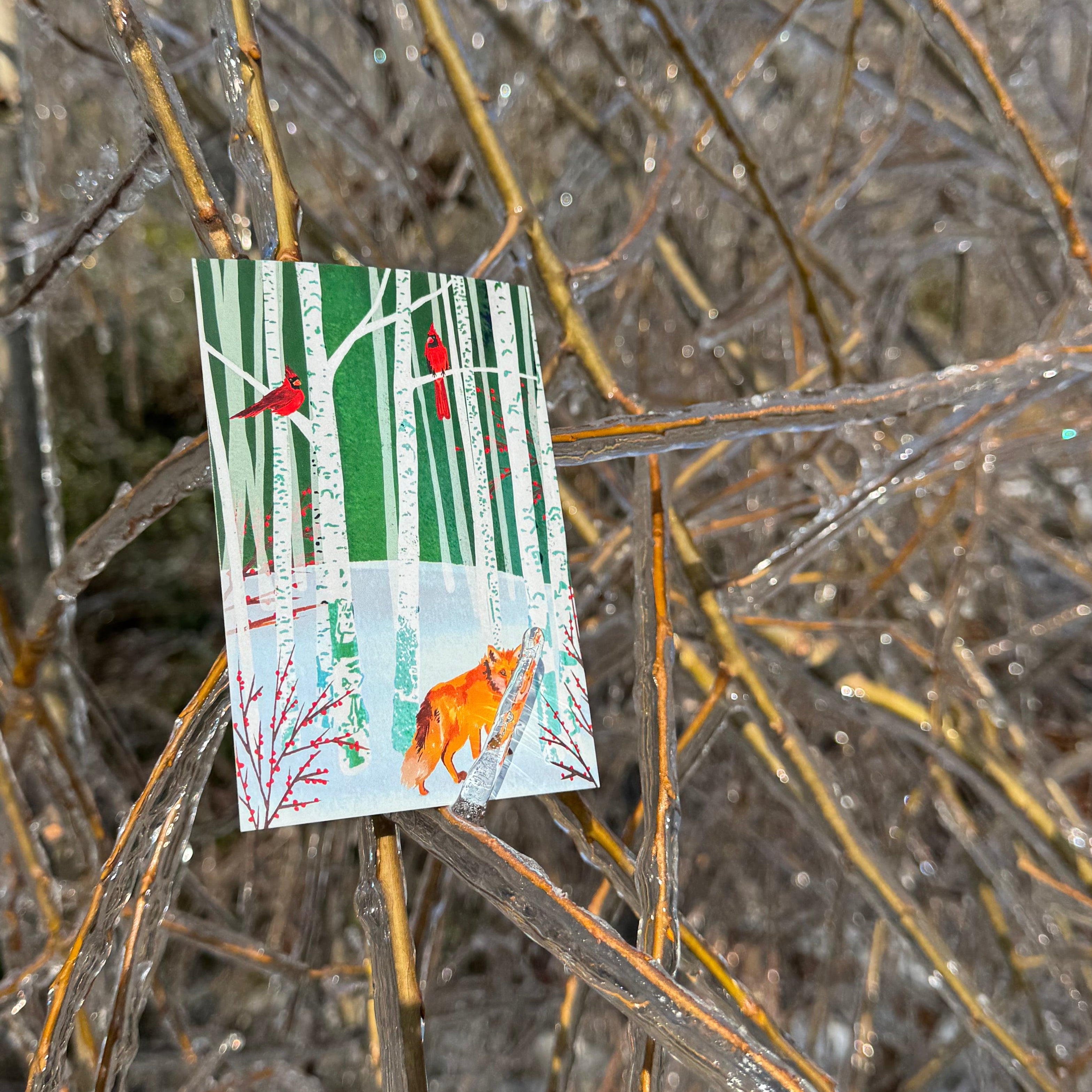 Send joy in the mail with this vibrant watercolor fox & cardinals postcard!
