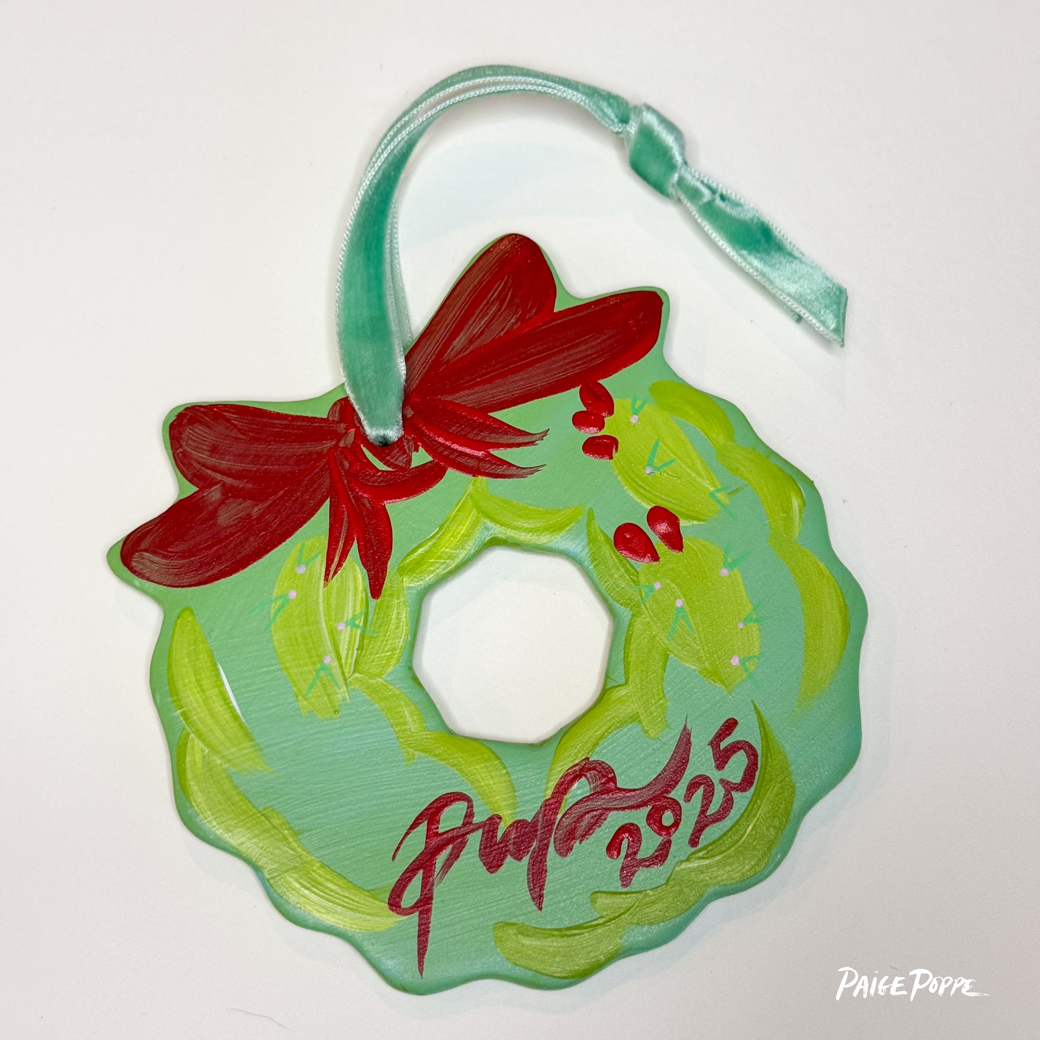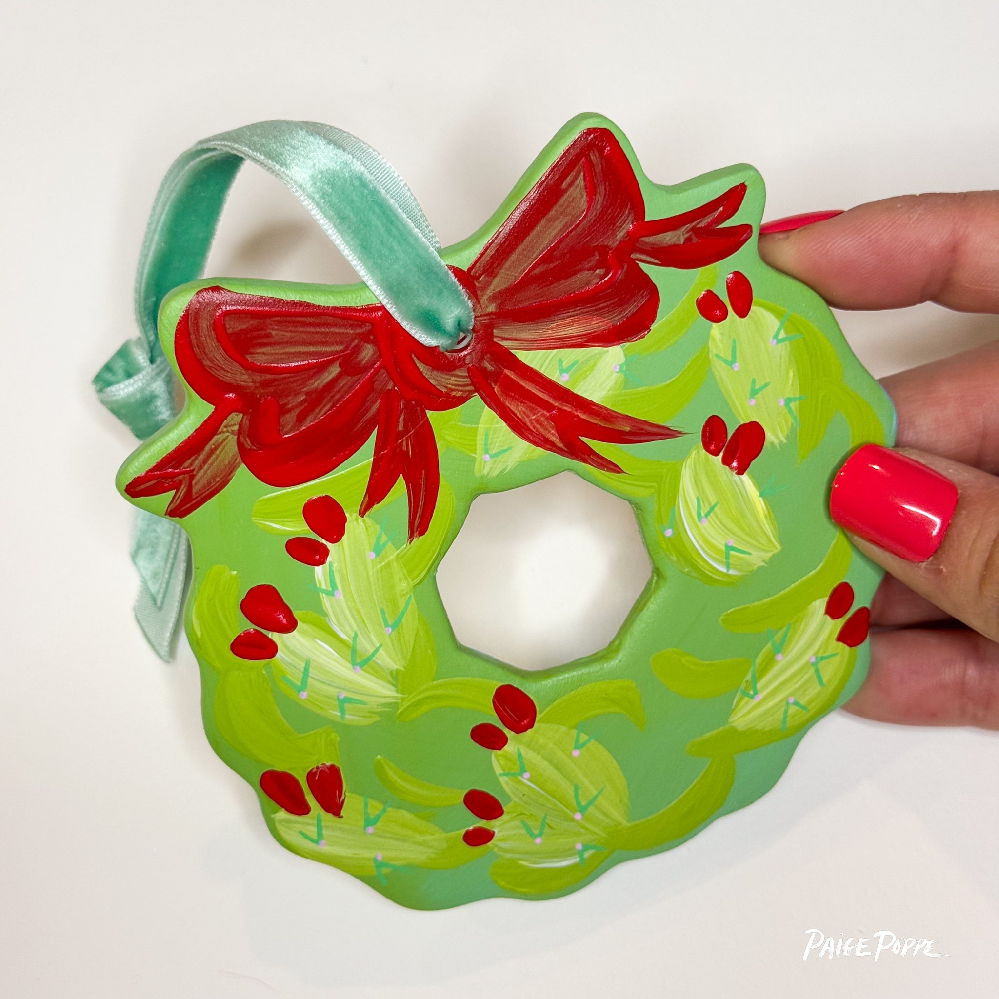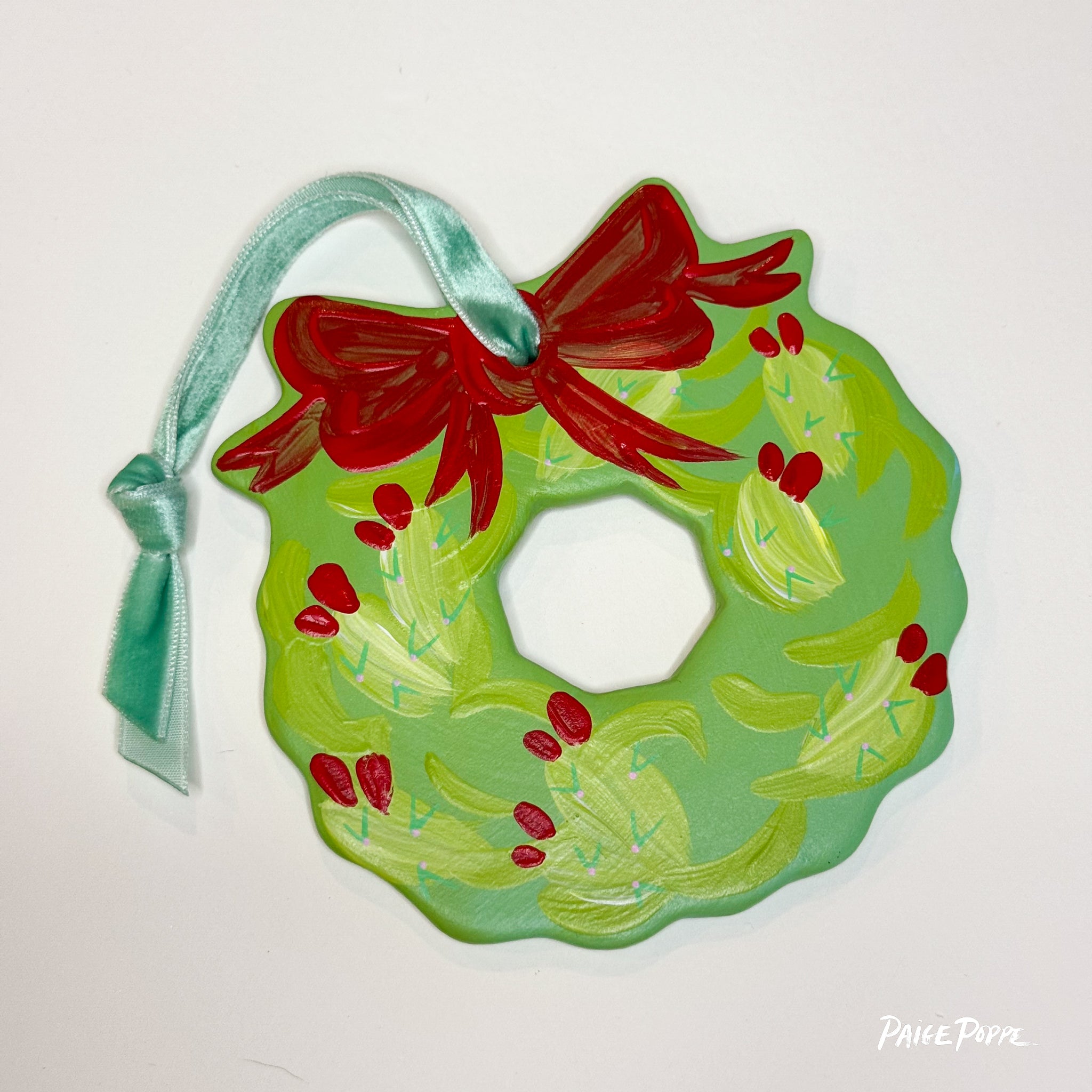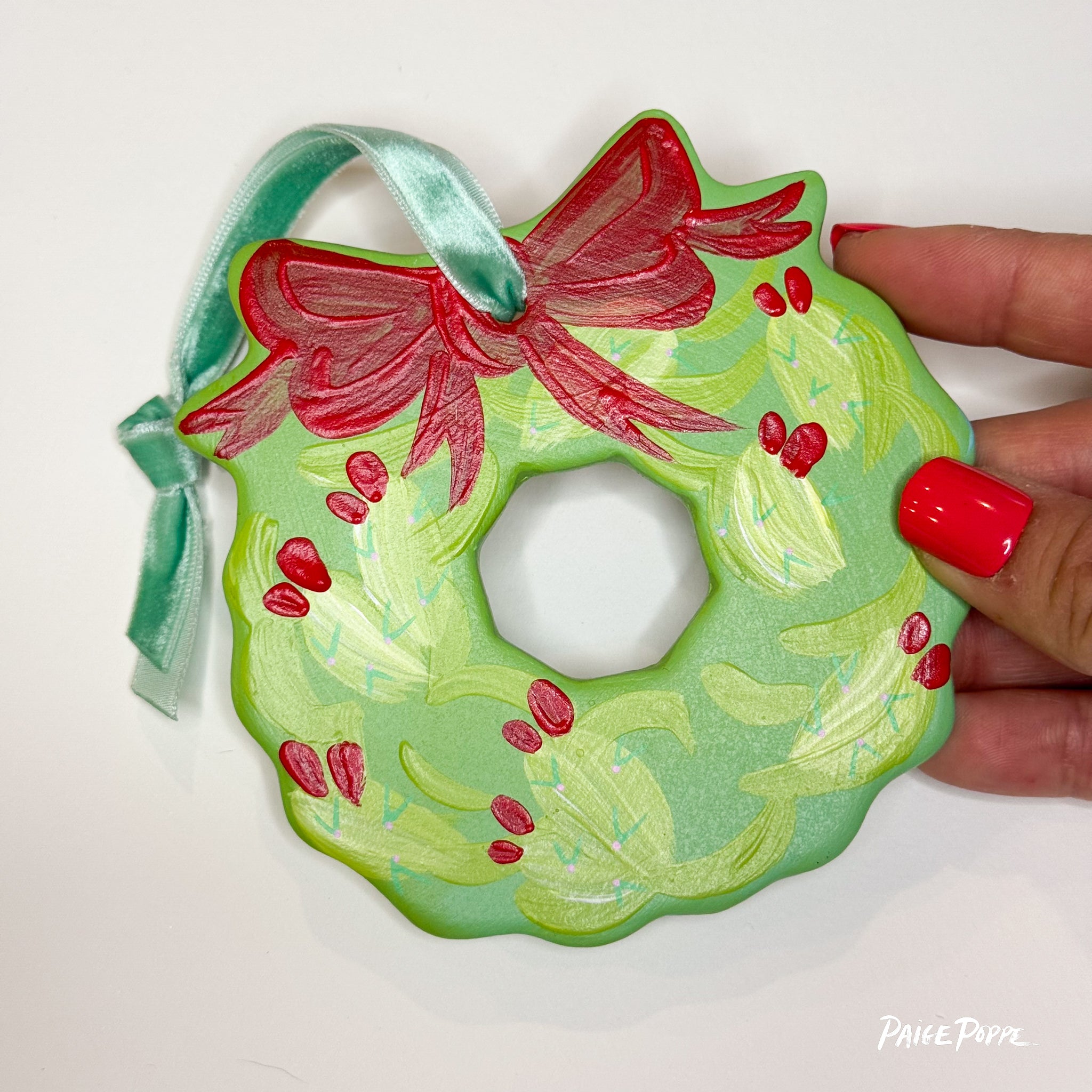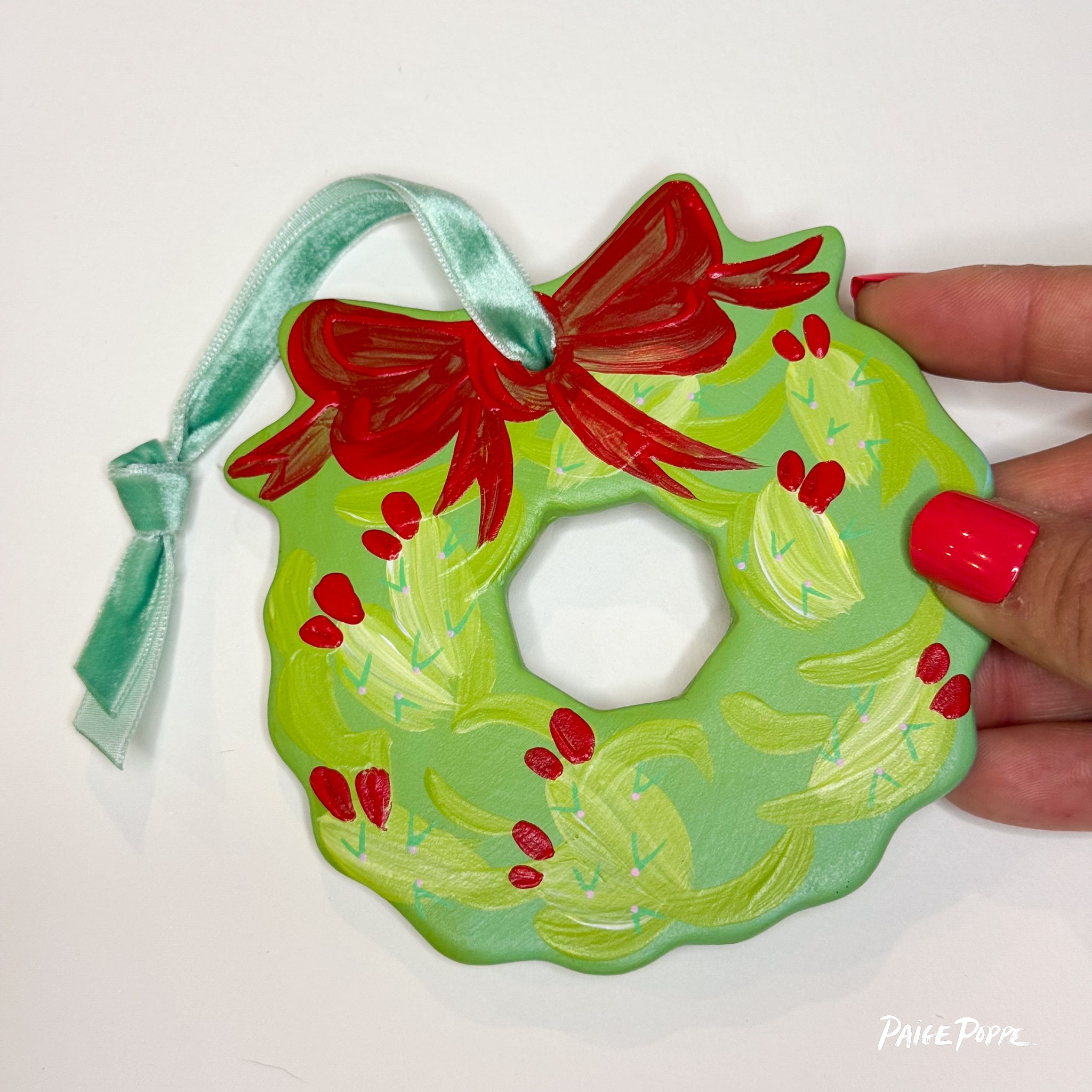 Spread nature's magic & holiday cheer with this hand painted ceramic ornament created by Artist, Paige Poppe! Each Wreath Ornament features my signature vibrant colors & thoughtful details hand painted in my sunny studio, sealed with a satin glaze to enjoy for years to come. Tied up with a colorful velvet ribbon, this is the perfect keepsake to celebrate the holiday season and celebrate nature's magic.